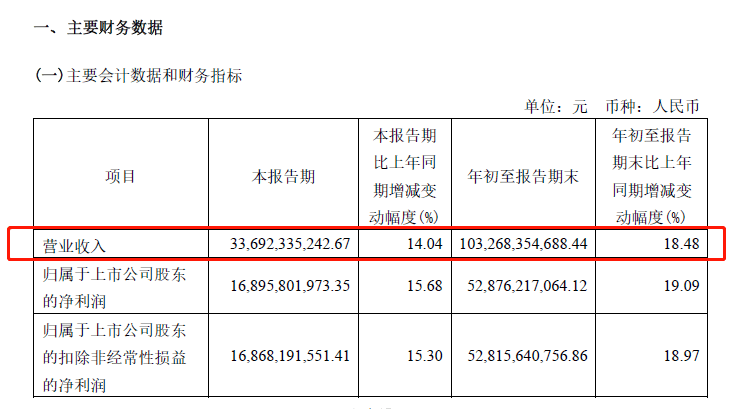 如今正是时候。贵州茅台近期发布的2023年第三季度报告显示,贵州茅台在1-9月实现营业收入1032.68亿元,同比增长18.48%;归属于上市公司股东的净利润为528.76亿元,同比增长19.09%。