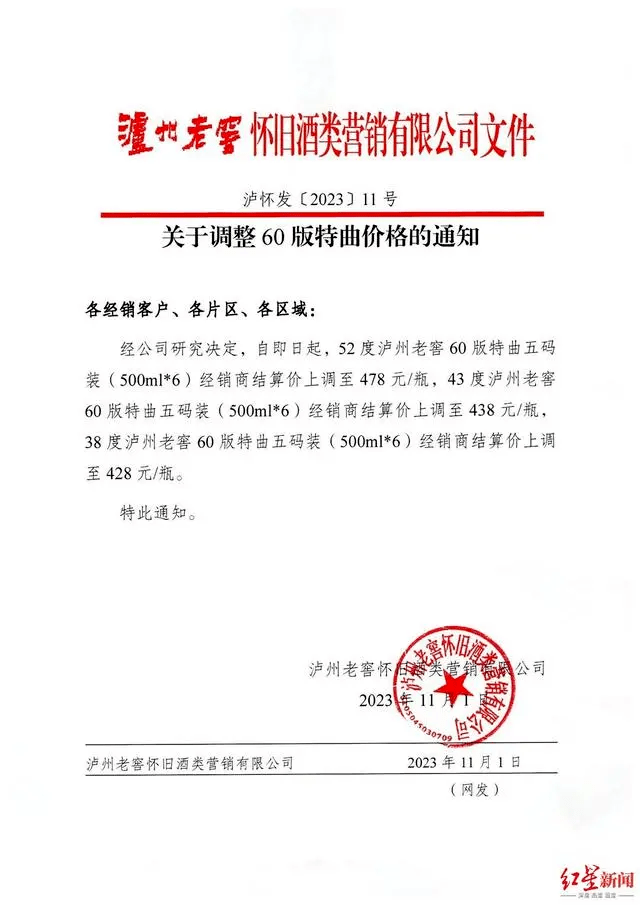 前些天,泸州老窖怀旧酒类营销有限公司的一份提价通知文件在酒圈疯传,里面提到,三款不同度数的500ml“60版特曲”经销商结算价均有所上调,有相关人员回应称:提价策略早已制定,并不是跟风茅台。而泸州老窖涨价的产品也并非主打产品,与飞天茅台之于茅台的意义明显有所不同。