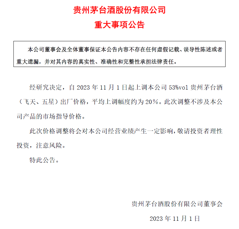 时隔六年,贵州茅台于10月31日晚宣布提价:自2023年11月1日起上调53%vol贵州茅台酒(飞天、五星)出厂价格,平均上调幅度约为20%。此次调整不涉及产品的市场指导价格。这意味着,在茅台营销收入占比最大的经典款飞天、五星茅台酒的出厂批发价会上浮至约1169元/瓶。
