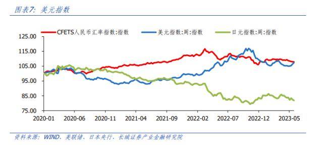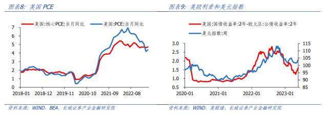 美国通胀反弹,或将迫使美联储无法结束加息周期。 2023年4月,美国PCE同比4.36%,出现反弹。且核心PCE同比4.70%,近六个月几乎没有任何回落迹象。市场本来预期美联储或将在6月结束加息,但通胀反弹或将迫使美联储不得不继续加息至更高水平。美国经济韧性强于预期,支撑利率回升,利差扩大造成资金回流,推动美元指数上行。