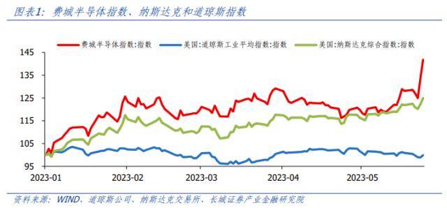 费城半导体指数大幅上涨,表明美国科技发展迅速。今年以来道琼斯工业平均指数几乎与年初持平,而纳斯达克指数反弹了25%,费城半导体指数甚至超过40%。自从年初AI火热以来,美国科技股就逆势上涨,走出独立行情。