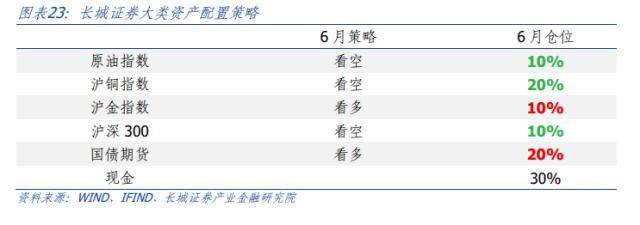 从全年经济周期来看,在主趋势上,欧美国家经济即将转入衰退周期,在副趋势上,中国经济复苏的斜率也将放缓,两方面均指向需求收缩压力。因此在资产配置上依然看空大宗商品。但目前阶段,美国经济不确定性较强,衰退需要等待数据验证,因此降低原油空头仓位至10%。铜产量持续过剩,上调空头仓位至20%。黄金保持10%多头。增加股票10%空头仓位。依然看多债券,仓位保持在20%。