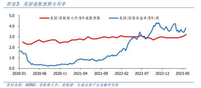 美国国债利率再次上升,美国经济韧性较强、通胀压力仍存。从5月12日开始,美国十年期国债利率就从3.39%上升至目前的3.8%,收益率曲线平坦化。另外我们也观察到密歇根大学公布的5年期通胀预期在5月份再次回升,这也预示着美国利率再回上升趋势中。