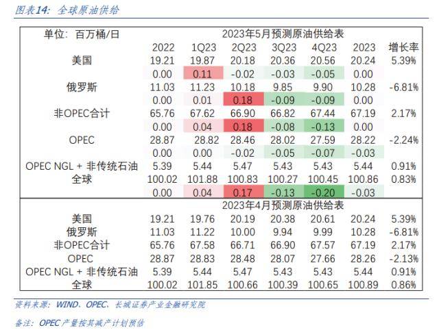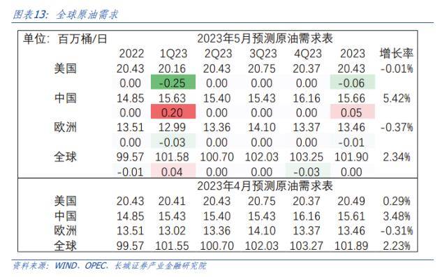 从需求角度,OPEC下调2023年Q4全球原油需求量。根据5月份OPEC月报,预估美国一季度原油需求较4月份预测减少了25万桶/日,而中国一季度原油需求增加了20万桶/日,美国减少的原油需求超过中国增加的原油需求。从全球角度,OPEC将2023年第四季度的原油需求下调了3万桶/日。总体而言,5月份OPEC月报对一季度的调整较大,对下半年的调整较小,但趋势仍是在下调全球原油需求。