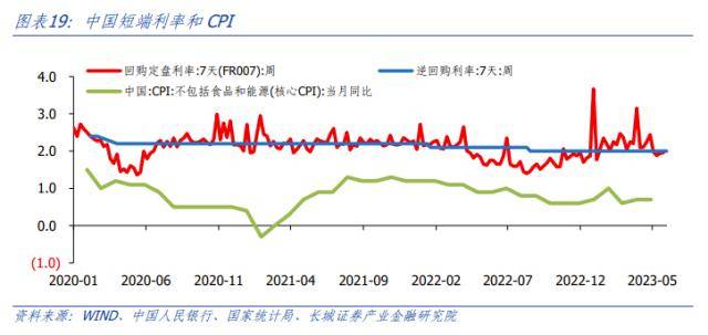 5月份在经济表现低于预期、环比动能转弱的背景下,市场对于降息的预期再次提升。尤其是7天回购利率降至逆回购利率之下,刺激了市场做多情绪。在2022年,央行多次降息均在市场利率低于政策利率条件下发生的。同时我们发现核心CPI同比虽在去年四季度略有回升,但现在又回到缓慢回落过程中。