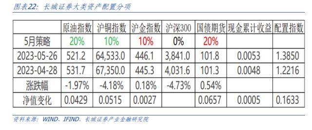 五月份长城大类资产配置指数从4月28日的122.16上涨至5月26日的138.50。五月份,我们所配置的仓位都取得了正收益。截止5月26日,原油指数下跌1.97%,拉高大类资产指数4.29个百分点。沪铜指数下跌4.18%,拉高大类资产指数5.15个百分点。沪金指数上涨0.18%,拉高大类资产指数0.27个百分点。十年期国债期货(T2306)上涨0.54%,拉高大类资产指数6.57个百分点。