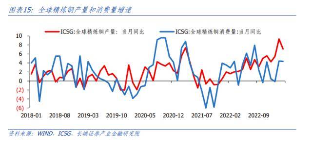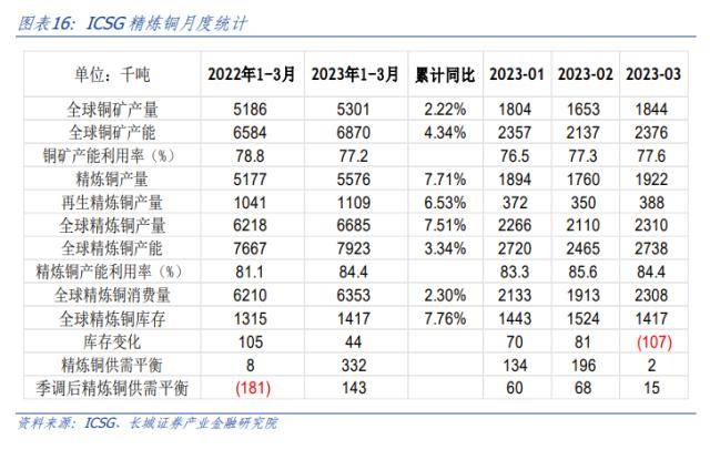 根据ICSG报告,一季度全球铜产量过剩33.2万吨。2023年3月,全球精炼铜消费量230.8万吨,同比增长4.34%。全球精炼铜产量231万吨,同比增长7.09%。铜产量增速远高于消费量增速。并且,从上游铜矿的产能利用率来看,3月铜矿产能利用率77.6%,还没有达到80%,因此扩产空间较为充足。
