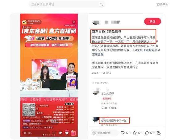 相比24期券,12期券的发放量要大得多。@还有一位姐妹分享道,她只抽了一次,就中了免息券,券在一天内就到账了。在帖子的评论区还透露,在采销直播间以外,京东金融自己的官方直播间有更多福利可拿。有不少姐妹都按照推荐指南来到 京东金融直播间,同样如愿以偿地获得了免息券。