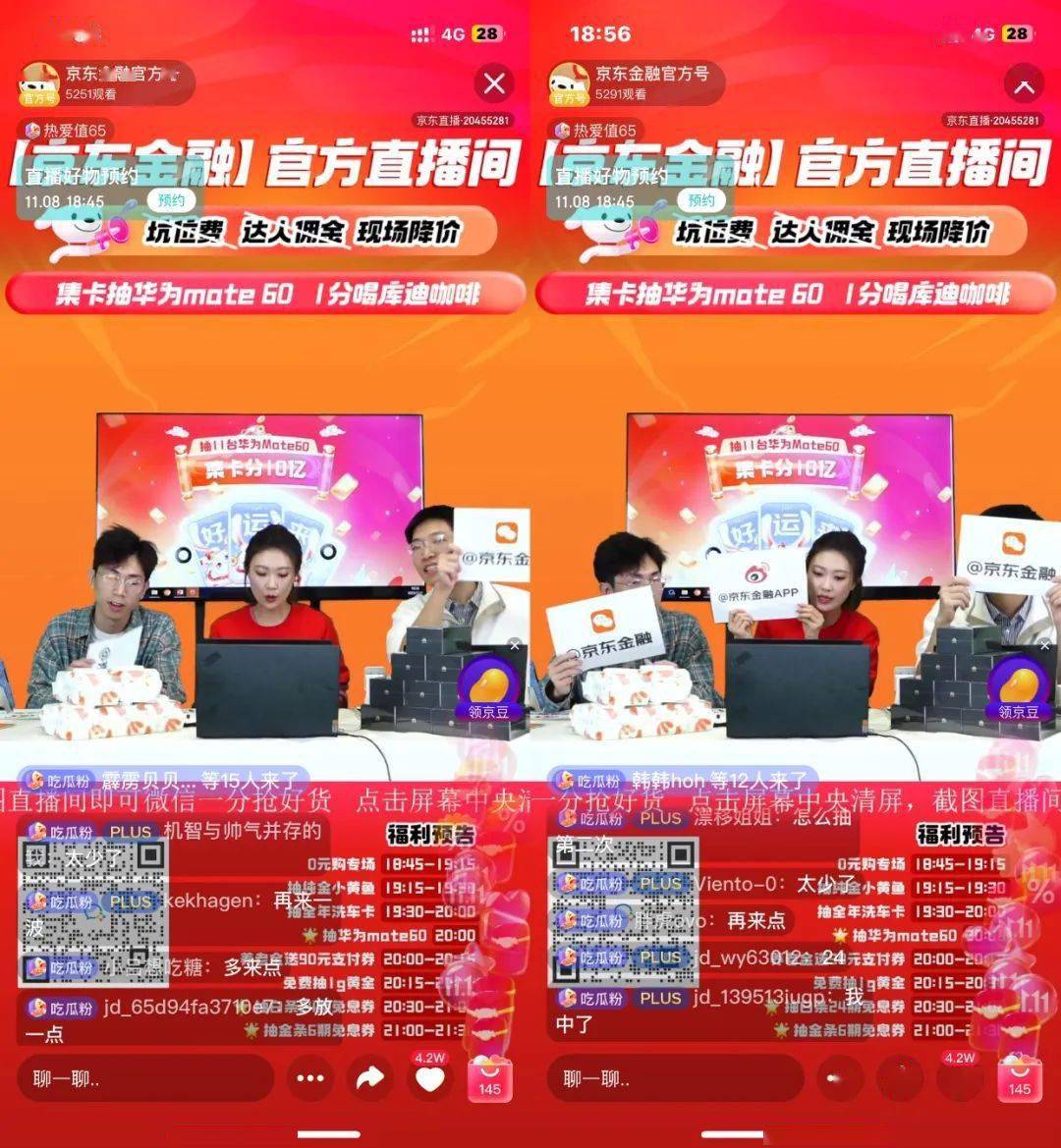 11.11期间,打开京东金融官方直播间,你会看到诸如“京东白条24期免息券、京东金条免息券、大额支付券,到实体黄金、全年免费洗车卡、华为mate60手机,以及0元购专场、车险五折、养老金开户得购物券”等一系列产品服务可供选择。