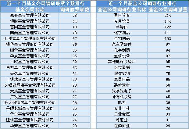 近一个月(5月27日-6月27日),嘉实基金参与公司调研的数量最多,共调研58家上市公司,然后调研较为活跃的还有博时基金、富国基金和国泰基金,分别调研44家、40家、40家上市公司;从调研行业上来看,基金公司对通用设备行业的上市公司调研次数最多,共有214次,其次是专用设备行业,基金公司调研了174次。