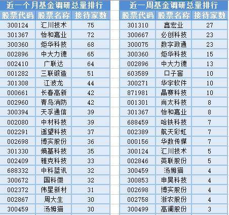 从个股调研情况上来看,最近1个月(5月27日-6月27日)最受公募基金关注的是汇川技术,属于电子元件行业,主营业务为工业自动化产品的研发、生产和销售,共有75家基金管理公司参与调研,其次是怡和嘉业和炬华科技,分别接受72家、68家基金管理公司的调研;