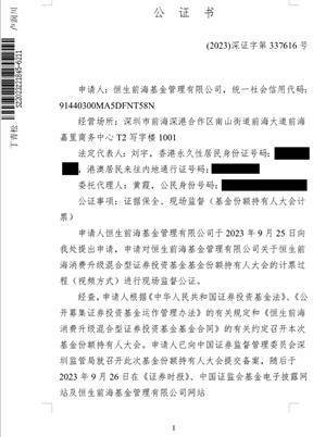 恒生前海基金管理有限公司(以下简称“基金管理人”)以通讯方式组织召开了本基金基金份额持有人大会,审议了《关于持续运作恒生前海消费升级混合型证券投资基金的议案》(以下简称“本次会议议案”),本次基金份额持有人大会投票表决时间自2023年10月9日起,至2023年11月9日 17:00 止,计票时间为2023年11月10日。本次基金份额持有人大会的计票工作由基金管理人授权的两名监督员在本基金托管人中国工商银行股份有限公司授权代表的监督下进行,广东省深圳市深圳公证处对计票过程及结果进行了公证。