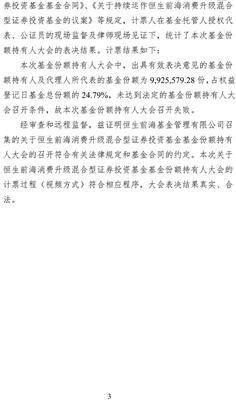 根据《中华人民共和国证券投资基金法》(以下简称“《基金法》”)、《公开募集证券投资基金运作管理办法》(以下简称“《运作办法》”)等法律法规的规定和《恒生前海消费升级混合型证券投资基金基金合同》(以下简称“《基金合同》”)的有关约定,现将恒生前海消费升级混合型证券投资基金(以下简称“本基金”)基金份额持有人大会的参会情况统计结果及相关事项公告如下: