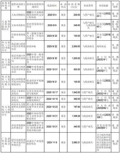 天水华天科技股份有限公司(以下简称“公司”)及子公司自2023年7月1日至2023年11月9日期间,获得的政府补助具体情况如下所示: