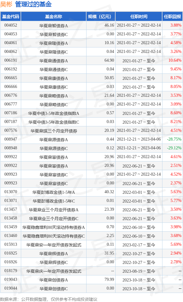 吴彬先生:金融硕士学历,中国国籍,2015年7月加入华夏基金管理有限公司,历任固定收益部研究员,华夏鼎富债券型证券投资基金基金经理(2021年1月27日至2022年2月14日期间),华夏鼎智债券型证券投资基金基金经理(2021年1月27日至2022年2月14日期间)、华夏鼎隆债券型证券投资基金基金经理(2021年1月27日至2022年2月14日期间)、华夏鼎略债券型证券投资基金基金经理(2021年1月27日至2022年2月14日期间)、华夏鼎琪三个月定期开放债券型发起式证券投资基金基金经理(2021年1月27日至2022年2月14日期间)等,现任华夏中债3-5年政策性金融债指数证券投资基金基金经理(2021年1月27日起任职)、华夏鼎通债券型证券投资基金基金经理(2021年1月27日起任职)、华夏鼎康债券型证券投资基金基金经理(2021年1月27日起任职)、华夏鼎源债券型证券投资基金基金经理(2021年12月21日至2023年4月6日任职)、华夏彭博巴克莱中国政策性银行债券1-5年指数证券投资基金基金经理(2022年3月1日起任职)、华夏稳鑫增利80天滚动持有债券型证券投资基金基金经理(2022年6月10日起任职)、华夏鼎富债券型证券投资基金基金经理(2022年6月21日起任职)、华夏鼎业三个月定期开放债券型证券投资基金基金经理(2022年6月21日起任职)、华夏鼎辉债券型证券投资基金基金经理(2022年10月27日起任职)。华夏鼎安一年定期开放债券型发起式证券投资基金基金经理(2023年2月17日起任职)。