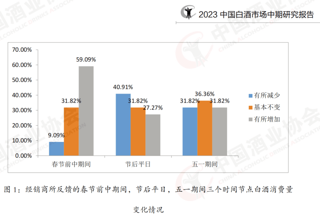报告提供的数据显示,春节期间白酒销售迎来一波小高峰,近6成白酒经销商表示消费量较往年有所增加。 但春节到五一之间的日常销售里,却有超过4成经销商表示较往年有所减少。而五一期间的消费更是有约32%的经销商表示销售下降。