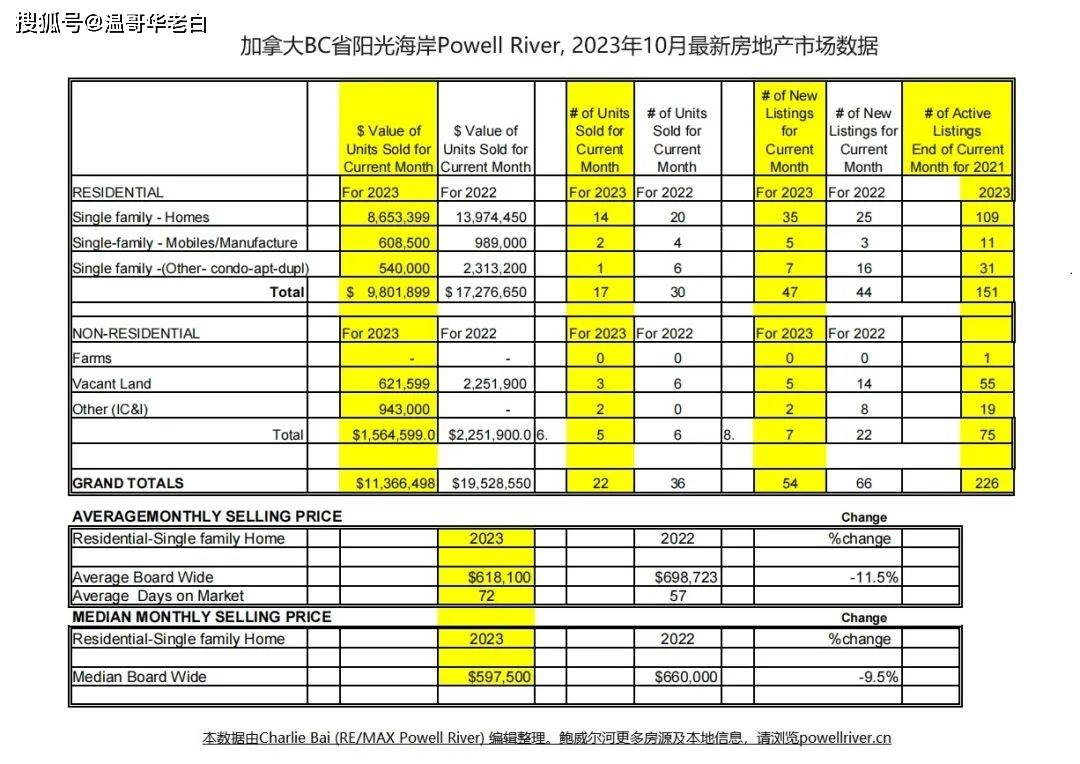 本周,加拿大BC省阳光海岸鲍威尔河地产局(PRSCREB, Powell River Sunshine Coast Real Estate Board)发布了2023年10月份的最新房地产市场行情报告。报告显示,Powell River的房地产销售呈现量价齐跌的走势。事实证明,9月市场出现的大幅反弹仅为昙花一现,下面就由老白来为大家做详细解读。