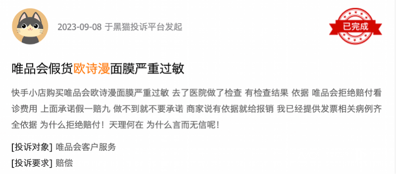 另一国货品牌欧诗漫OSM,在黑猫上的投诉近两百条,不少消费者投诉称,使用欧诗漫的水乳、面膜等产品后全脸过敏,退款退货却遭到拒绝。该品牌在去年宣称推出自研革新美白成分珍白因Pro,并与李佳琦团队共创出珍白因水乳、面霜等多个爆款产品。