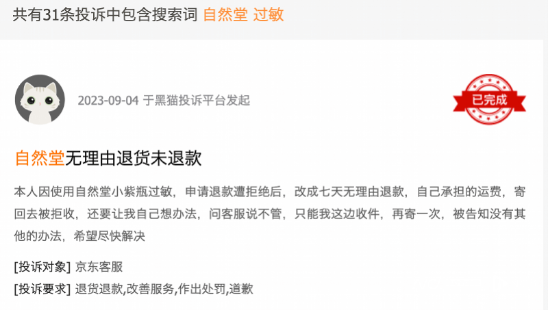 将“天然成分”“尖端科技”“卓越功效”等作为品牌宗旨的自然堂,在黑猫上也有不少关于产品过敏的投诉,涉及产品包括精华、面膜等。