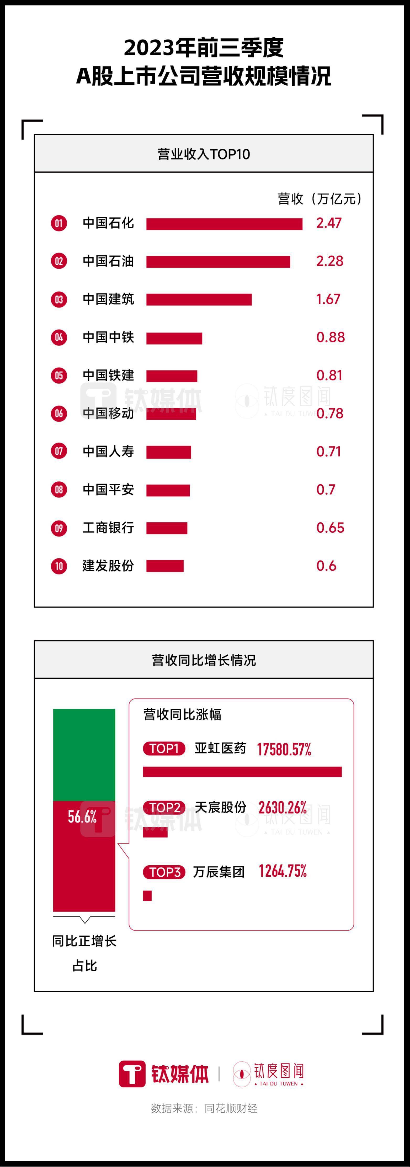 在已披露业绩的5293家上市公司中,有85家上市公司2023年前三季度营收规模超过千亿元,其中,中国石化、中国石油以及中国建筑三家大型央企营业收入更是超过了万亿元,分别达到2.47万亿元、2.28万亿元以及1.67万亿元。此外,占比约56.6%的上市公司2023年前三季度营收同比上涨,其中,亚虹医药、天宸股份以及万辰集团营业收入增幅超过10倍,分别为17580.57%、2630.26%和1264.75%。
