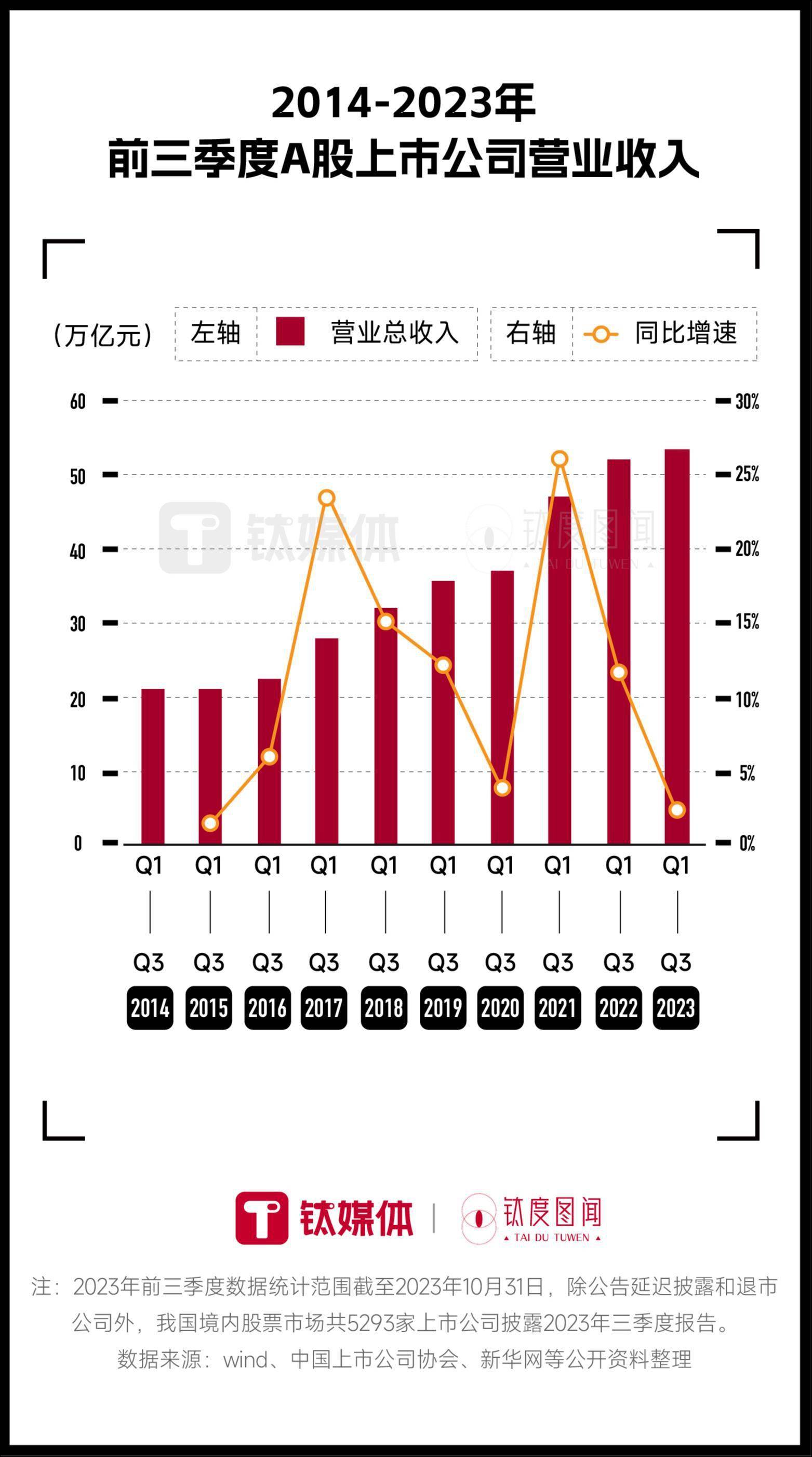 总体来看,截至2023年10月31日,除公告延迟披露和退市公司外,2023年前三季度,我国境内股票市场上市公司(A股)共实现营业收入53.6万亿元,同比增长2.35%。与历史对比,2023年A股三季报营收水平创近年来历史新高,整体经营业绩加快向好。