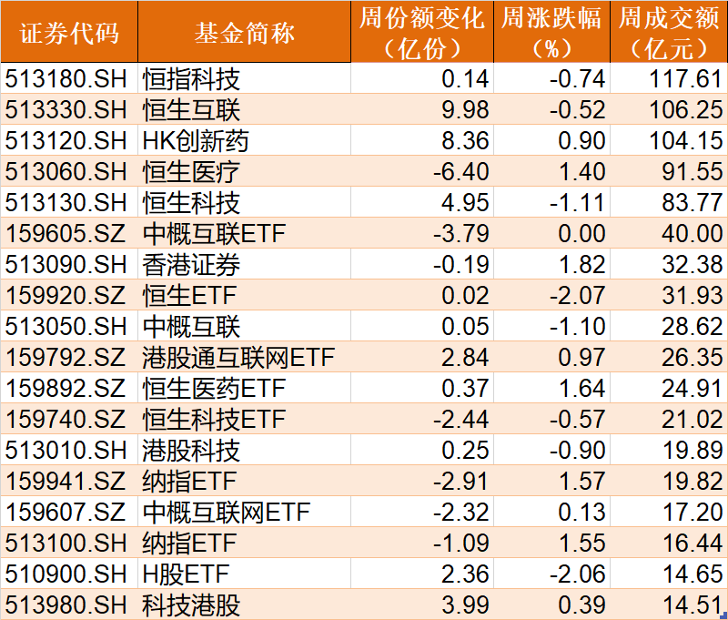 跨境ETF本周成交额超过10亿元的有18只,其中恒指科技、恒生互联、HK创新药周成交额突破100亿元。从市场表现看,恒生ETF、H股ETF跌超2%,恒生医疗、香港证券、恒生医药ETF等涨逾1%。