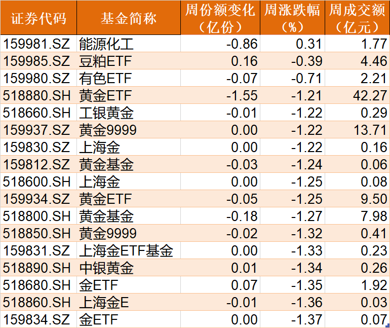 商品ETF本周普遍走弱,除能源化工上涨0.31%外,其余品种均出现下跌,其中黄金相关ETF普跌逾1%。