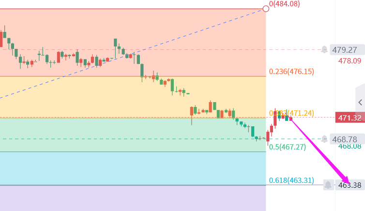 国内金走势分析:黄金期货价格昨日美盘受到消息刺激强势拉升,但是没有真正突破472,属于下跌过程中的反抽,跌势没有改变,今日反弹后还是继续空,依托475的压力做空,反弹靠近475附近后即可直接空!黄金期货从4小时上看,黄金构建头肩顶形态后破位下跌,已经完全开启下跌趋势!日线上也已经跌破了布林中轨的支撑,接下来的走势必定是要不断地靠近日线布林下轨附近的!今日黄金还是要继续空,震荡调整结束后继续看跌!上方的压力就是475,无论多强的反弹最终都会再次跌落!而反弹的越高,下跌的将会越快!早盘靠近475附近即可再次进场空!