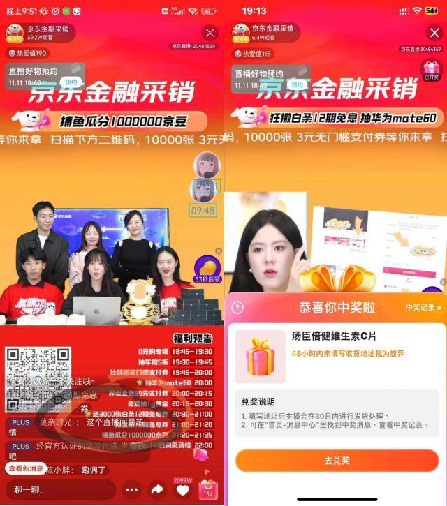 在支付券福利之外,京东金融还抽出多份大奖:华为Mate 60手机、实物黄金、加湿器、全年免费洗车卡、京东金融的白条IP小鹅公仔……有观众原本想来薅几张券,却抱着公仔或洗车卡离开,在弹幕中难掩自己的激动。