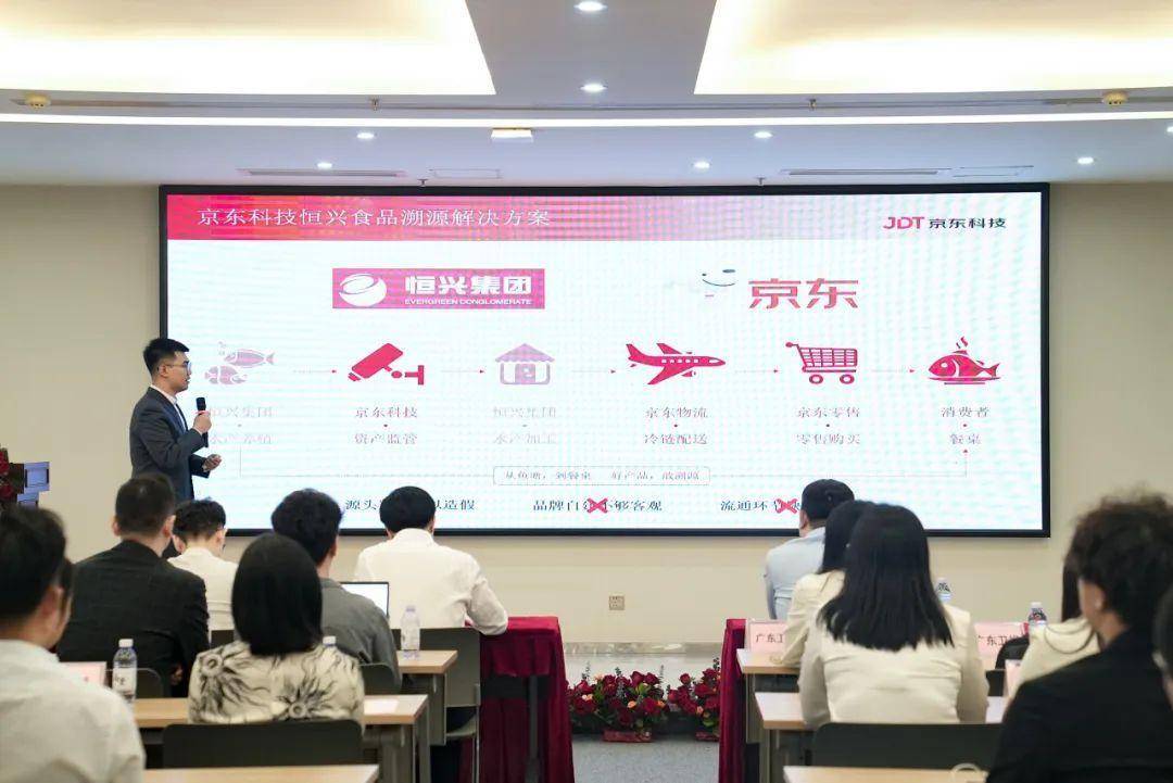 在恒兴食品溯源产品推介现场,京东科技农业金融科技部产品总经理刘丹阳介绍了恒兴溯源平台的特点。该平台利用物联网、GIS遥感影像、区块链、AI生长算法模型等技术实现原产地养殖数据的可信采集、存证及可视化呈现,并通过科学化流程管理工具为农产品生产过程提供标准、规范的数据录入与监管功能。可以确保恒兴水产食品在养殖、加工、流通过程的每个环节数据实时、准确、可追溯,为消费者提供一个可信的产品生长档案。