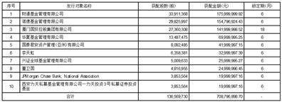 根据投资者询价情况及《认购邀请书》中确定的相关配售原则,发行人和保荐机构(主承销商)确定本次发行的发行价格为5.19元/股,发行股票的数量为136,569,730股,募集资金总额为708,796,898.70元。本次发行配售结果如下: