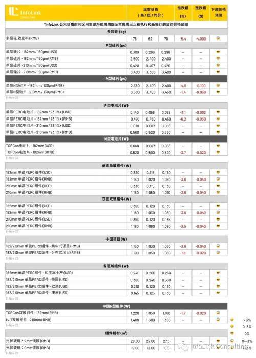 本周均价已经往每瓦1.05-1.08元人民币靠拢,预期12月主流价格将来到1-1.05的区间。厂家也在下调明年报价。价格的快速下跌,将开始加速产品迭代与洗牌。低价部分确实有跌破1元人民币的交单,但其交付仍是少量、且部分为海外拉回库存等等并不计入主流交付常规规格报价之中。