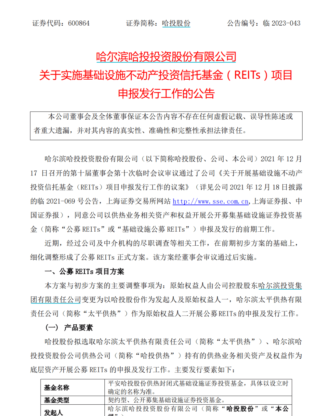 此外,哈投股份也公告实施基础设施不动产投资信托基金(REITs)项目申报发行工作,拟选取哈尔滨太平供热有限责任公司(简称“太平供热”)、哈尔滨哈投投资股份公司供热公司(简称“哈投供热”)持有的供热业务相关资产及权益作为底层资产开展公募REITs的申报及发行工作。