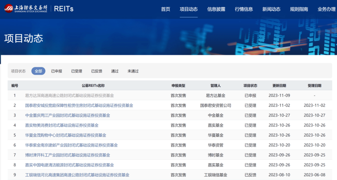 除了首批消费基础设施REITs外,上交所网站上,国泰君安城投宽庭保障性租赁住房REIT、中金重庆两江产业园REIT、华泰紫金南京建邺产业园REIT、博时津开科工产业园REIT、嘉实中国电建清洁能源REIT被受理,工银瑞信河北高速集团高速公路REIT已获反馈。