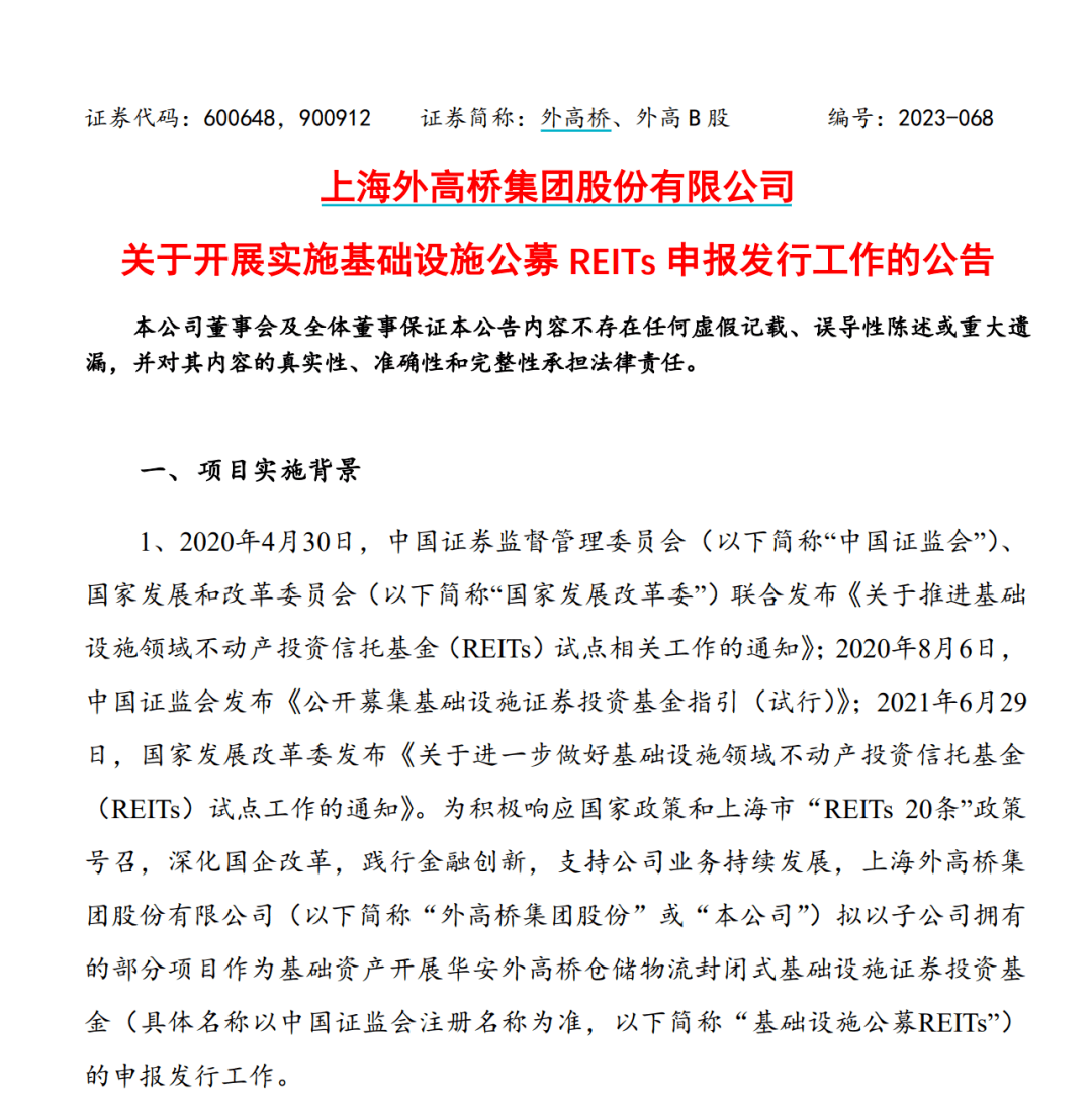 如外高桥公告开展实施基础设施公募REITs申报发行工作,拟以子公司拥有的部分项目作为基础资产开展华安外高桥仓储物流封闭式基础设施证券投资基金(具体名称以中国证监会注册名称为准)的申报发行工作。