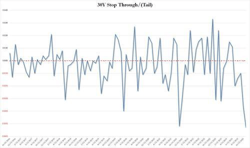 值得一提的是,在拍卖发生时的30年期美债预期收益率为4.716%,这等于得标利率产生了5.3个基点的“尾部”(Tail),是2016年有数据记录以来的史上最大尾部利差。