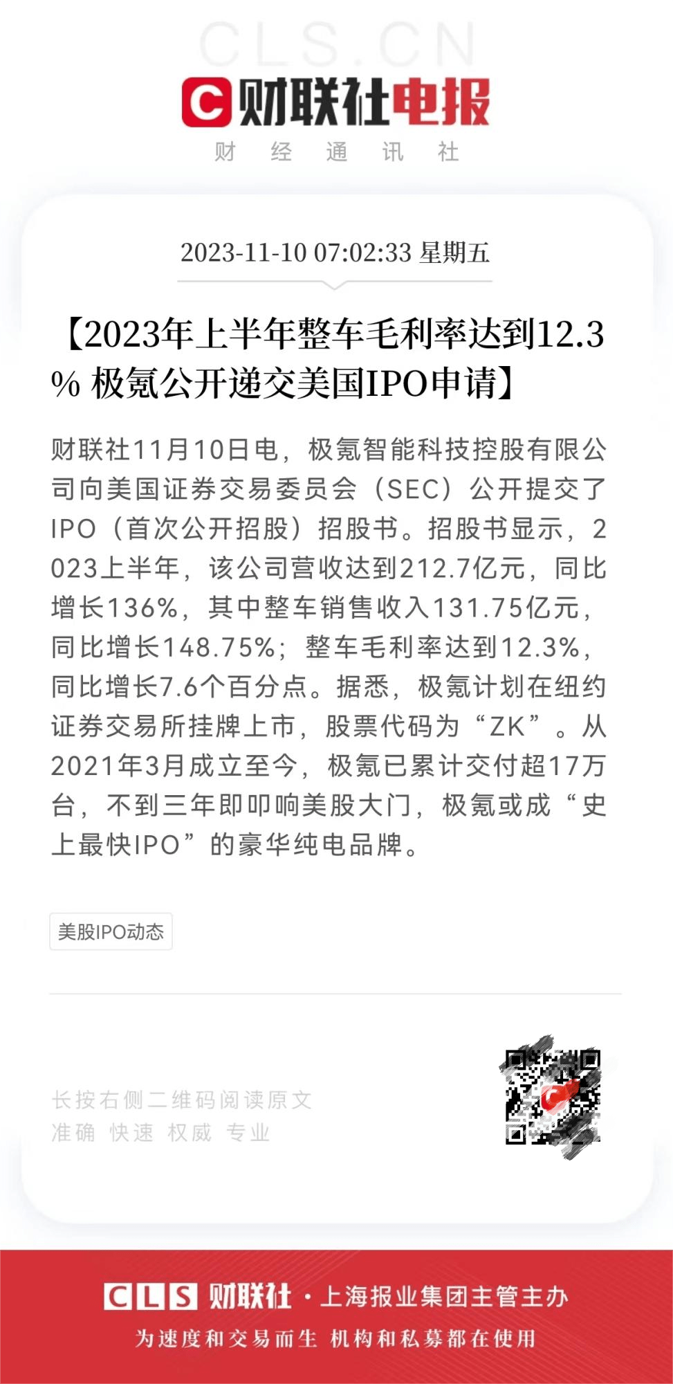 极氪智能科技控股有限公司向美国证券交易委员会(SEC)公开提交了IPO(首次公开招股)招股书,显示其计划在纽约证券交易所挂牌上市,股票代码为“ZK”。