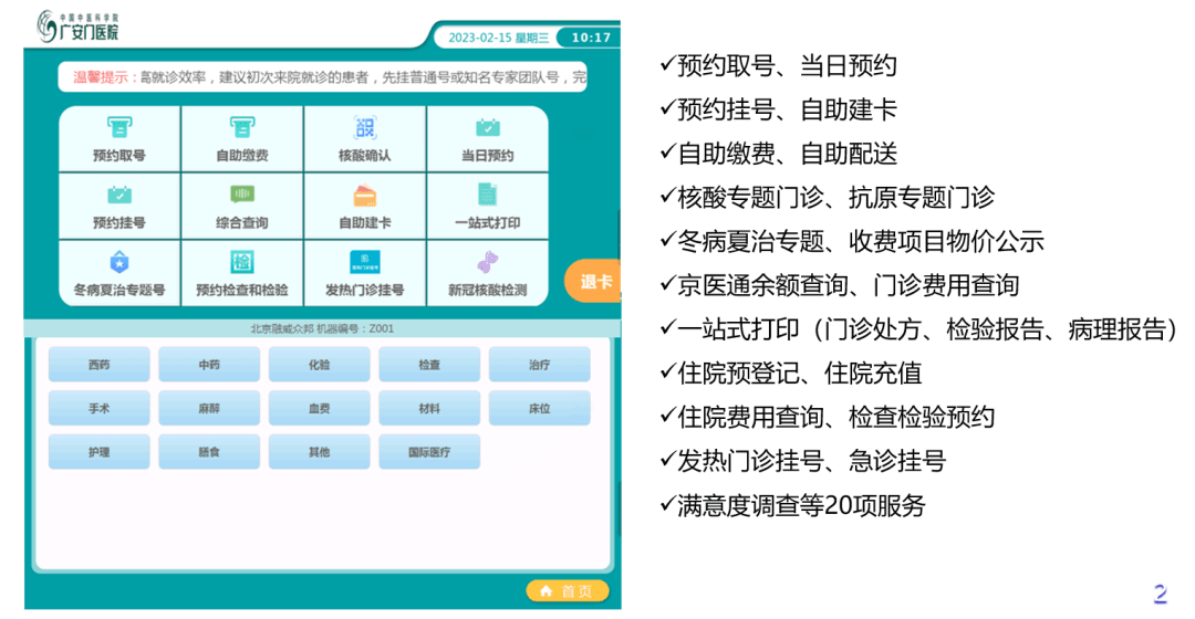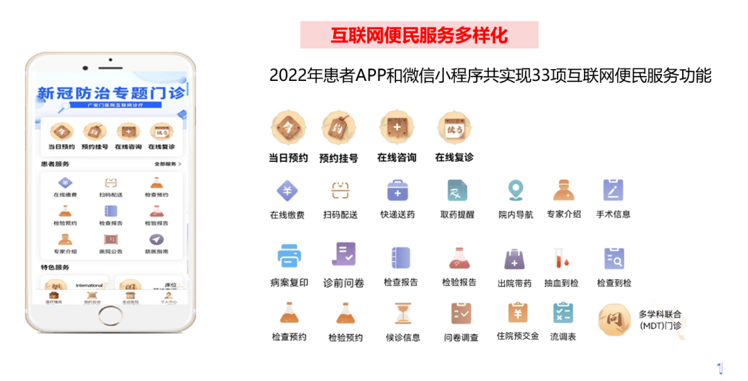 我院基于院内设备与患者自有设备,通过有机整合,数据互联互通,打造患者就医数字生态。目前共有20个应用模块,院区设多功能自助机106台,除建卡、挂号、缴费、查询等常规功能外,还支持检查检验打印、满意度调查、异地医保结算、住院预登记功能等特色功能,患者APP和微信小程序共实现33项互联网便民服务功能,支持病历复印、药品配送、智能导诊等功能,贯穿患者就医全流程。