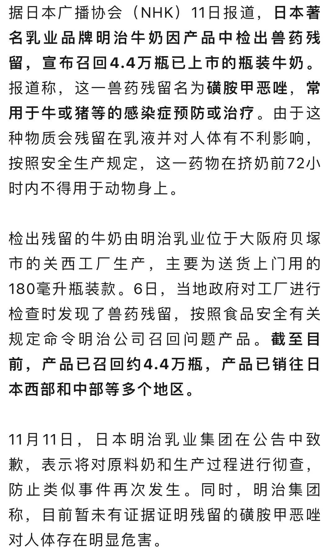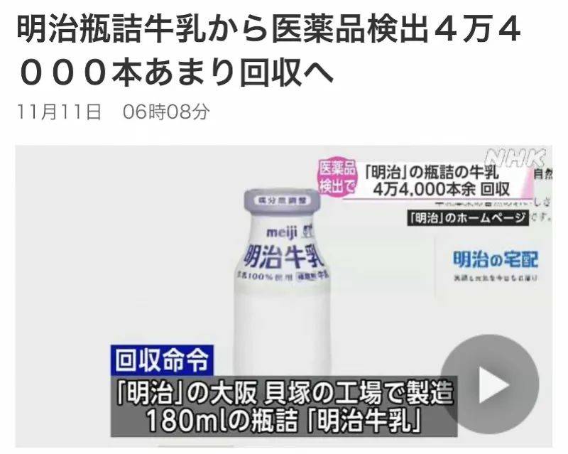 11月11日,南都记者从日本明治乳业集团获悉,其发布产品召回公告称,大阪府贝塚市的关西工厂生产的部分牛乳,被检查出含有兽药(磺胺甲恶唑)残留,将召回4.4万瓶已上市的瓶装牛奶。