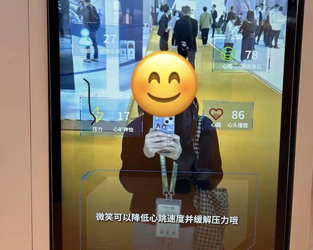 新周刊记者亲测显示,一个人只需要在这块巨大的全身镜面前站上10秒钟,内置的AI就能通过算法评估出眼前这个人的心跳、年龄、心情和压力水平。