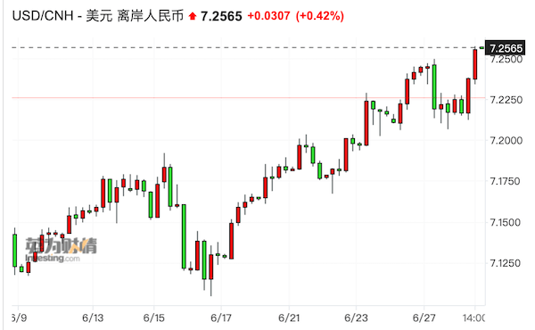 6月28日(周三)16时左右,离岸人民币对美元跌破7.25关口。上午公布的人民币对美元中间价与市场模型的预测基本保持一致,但第一财经记者也观察到,27日中间价的偏离程度较大。多位交易员和策略师对记者表示,27日中间价释放稳定信号,比模型预测的偏强超100点,这是今年以来罕见的偏离程度。