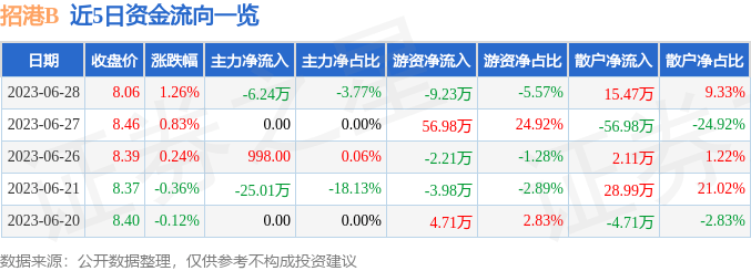 截至2023年6月28日收盘,招港B(201872)报收于8.06元,上涨1.26%,换手率0.11%,成交量2060.0手,成交额165.7万元。