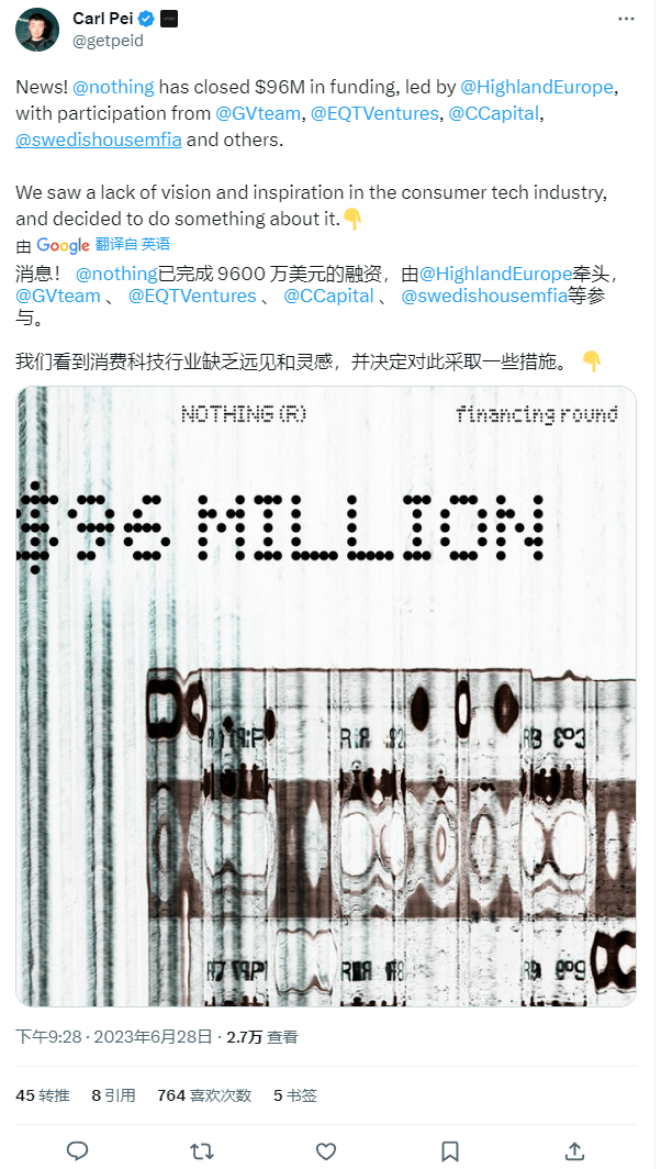 IT之家 6 月 28 日消息,Nothing 创始人兼 CEO 裴宇宣布,该公司已获得 9600 万美元(IT之家备注:当前约 6.93 亿元人民币)融资。