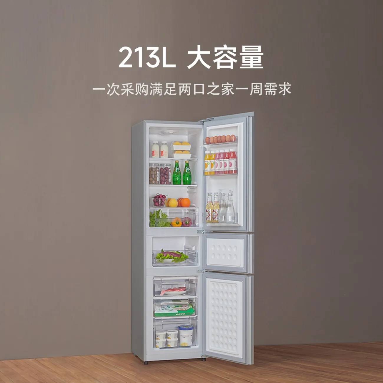 213升的容量一次性大采购也能装得下,并且分为了三门设计,上面是冷藏保鲜,主要用来给食物保鲜,适合存放蔬菜、水果以及饮料,下面是冷冻保存,适合需要长期保存的生鲜、冰淇淋等,中间还有一个适中的软冷冻层,为肉类短期储存而设立,保鲜一周不结冰口感更佳,并且随用随切很方面,所以三门冰箱设计基本上能完全覆盖家庭对冰箱的需求。