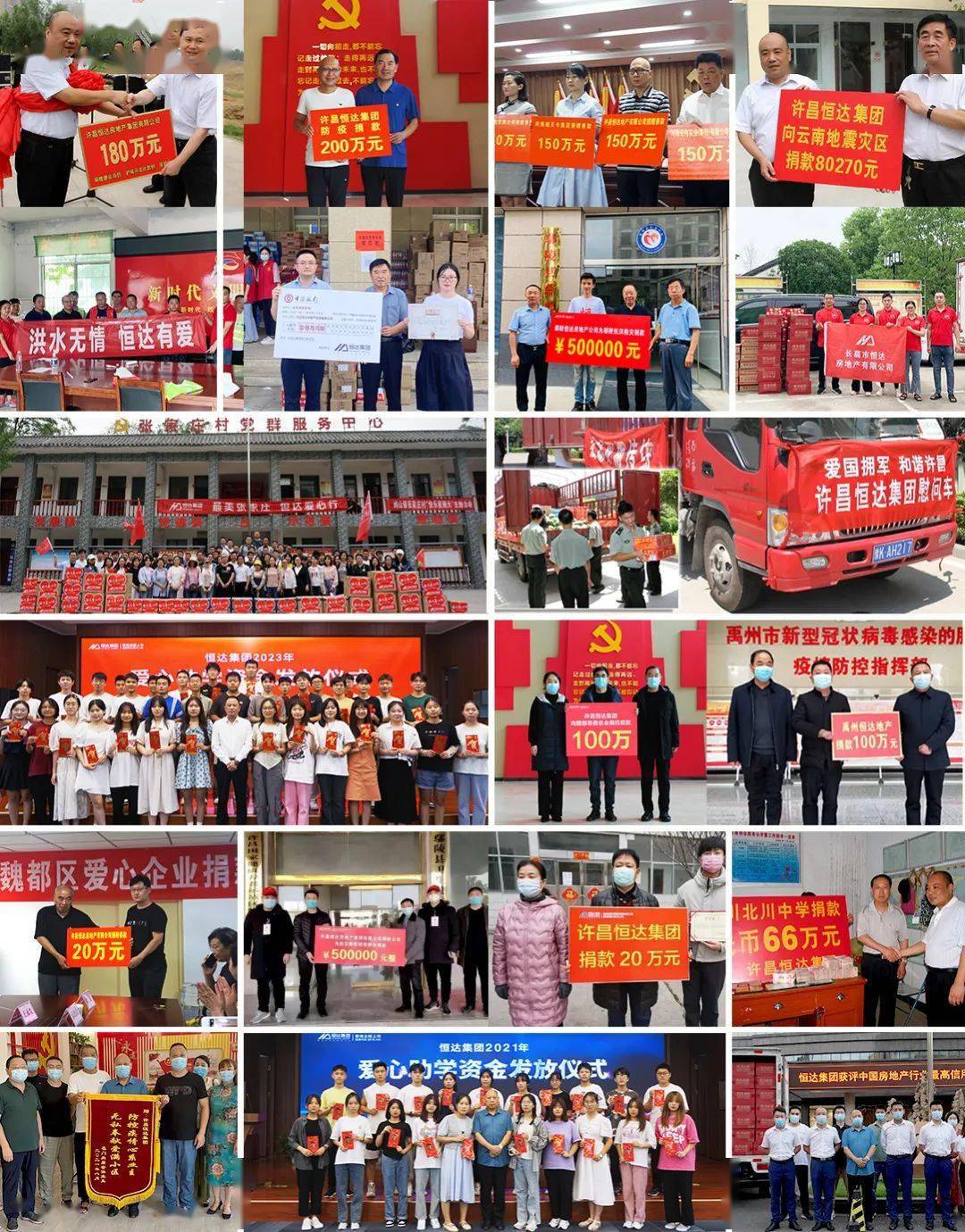 恒达集团积极投身城市公共建设、抗震救灾、疫情防控、教育事业、爱心助学、扶贫济困等社会公益和慈善事业。截止2023年,集团累计捐款4563万余元。