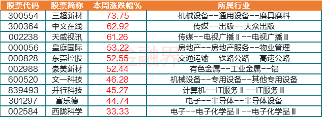 本周十大牛股中,半导体产业链成牛股摇篮,三超新材累计涨73.75%、皇庭国际累计涨53.22%、文一科技累计涨46.28%、富乐德累计涨44.74%、西陇科学涨33.33%;
