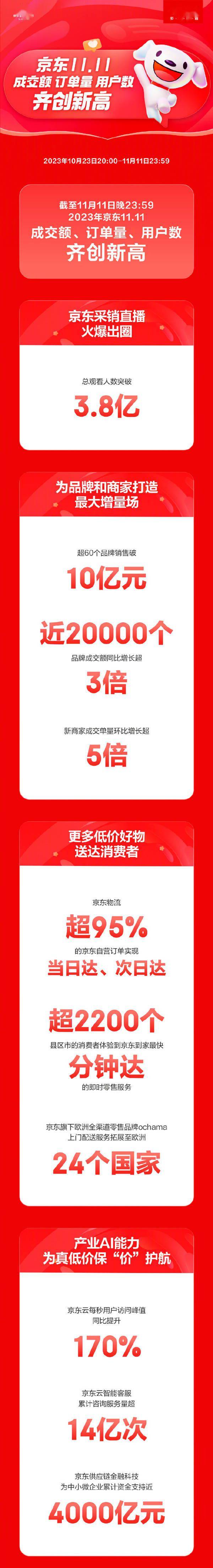 京东称,截至11月11日晚23:59,2023年京东11.11成交额、订单量、用户数齐创新高,京东采销直播的总观看人数已突破3.8亿。“9块9包邮”“百亿补贴”“京东秒杀”为品牌和商家打造了一个又一个增量场,目前累计超过60个品牌销售破10亿元,近20000个品牌成交额同比增长超3倍,新商家成交单量环比增长超5倍。