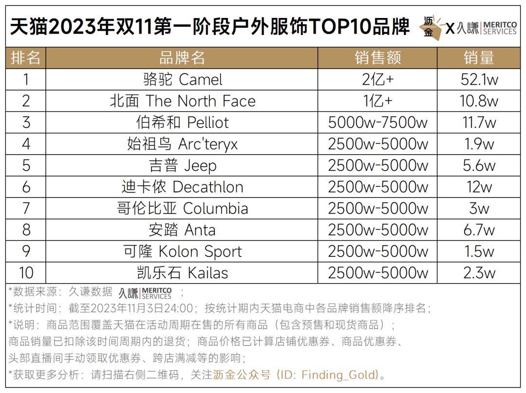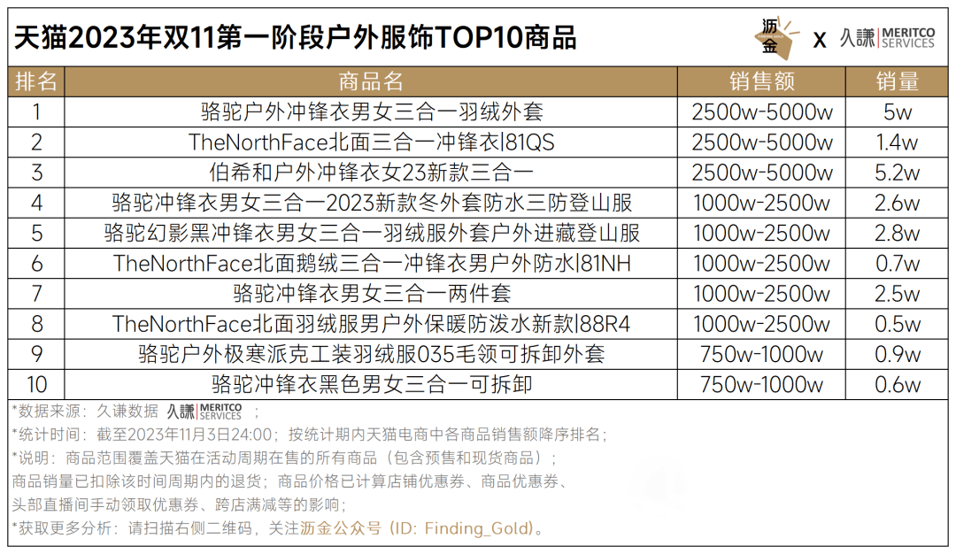 TOP10商品榜中,国货品牌占七成,这意味着国货品牌在户外运动领域的消费者心智在不断提高。且榜内几乎全是冲锋衣,其中骆驼凭借核心大单品三合一冲锋衣在商品榜TOP5中占三席,累计销售额超5000万。近年来国内户外市场增速飞快,国货品牌可重点布局冲锋衣等品类抢占市场份额。