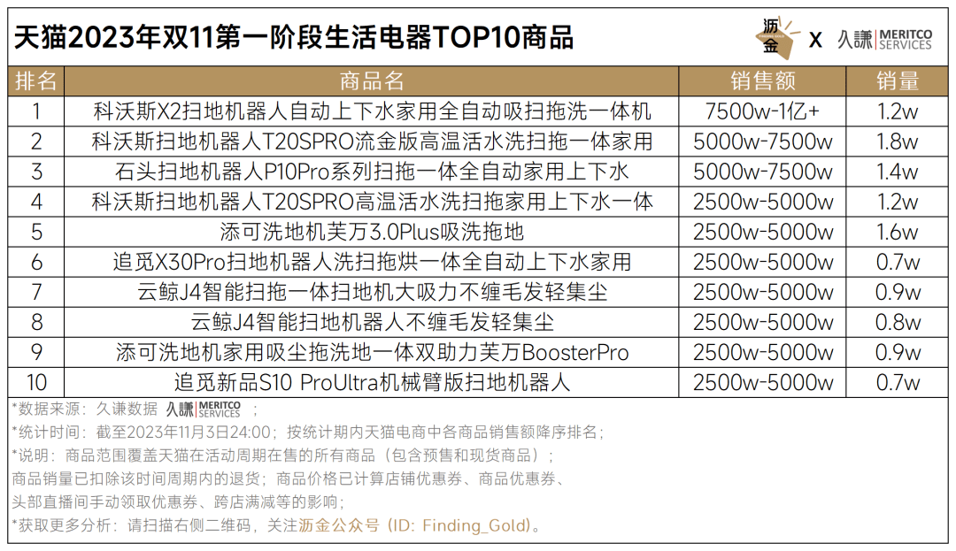 再看TOP10商品榜单,商品多集中于扫地机器人。科沃斯有三款产品上榜,一举拿下销售额和销量冠军。其他上榜单品就销售额和销量做比较,差距并不显著,说明该市场竞争较为激烈。