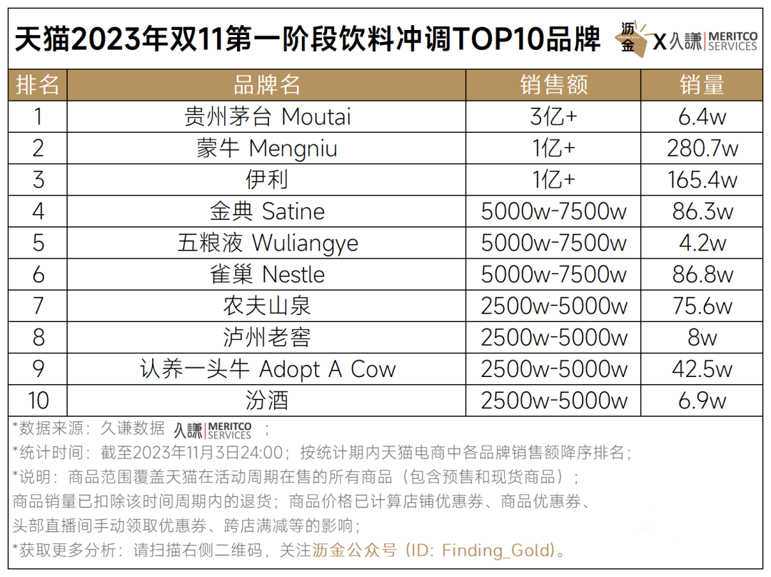 饮料冲调类目的TOP10品牌中,贵州茅台以超过3亿的销售额稳居榜首,紧随其后的是乳品品牌蒙牛,伊利以及其子品牌金典。榜单中白酒品牌与乳品品牌各占4席,而饮料品牌占2席。